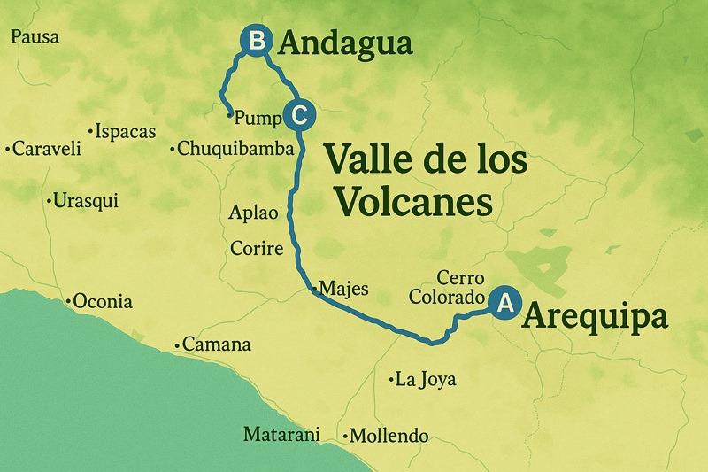 Set out on a 3-day overland journey from Arequipa to the hidden Valley of the Volcanoes Geopark (Valle de los Volcanes, Arequipa). Far from mass tourism, this off-the-beaten-path adventure takes you through dramatic volcanic landscapes, pristine lagoons, and secluded waterfalls.